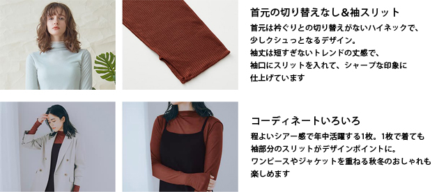 今回発売した「シアートップス」グループも、テンセル™モダールを採用したハイネック、ロングスリーブ、ハーフスリーブの3アイテムをラインアップ。頬ずりしたくなるほどなめらかで、とろけるような肌ざわりのほどよいシアー感のあるトップスです。1枚で着て透け感を楽しむ、レイヤードインナーとしてコーディネートを楽しむなど、シーンやスタイルに合わせてさまざまな着こなしができるアイテムです。