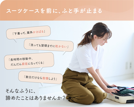 旅行や出張前のパッキング中に、「下着って意外にかさばる」「洗って使いたいけど乾くか心配」「長時間の移動には楽な下着がいいけど、フィット感もほしい」そんな悩みを感じたことはありませんか?意外と旅の準備でネックになるのが「下着」です。その悩みを解決するのが、ノンワイヤーブラジャー「エアヴェールブラ」です。ハンカチサイズにコンパクトにたためるうえ、やわらな肌あたりと安定したフィット感を両立。さらに、室内干しで4~5時間※で乾くので、旅先で洗っても翌朝には着用でき、長期間の旅や出張でも数枚で対応できます。