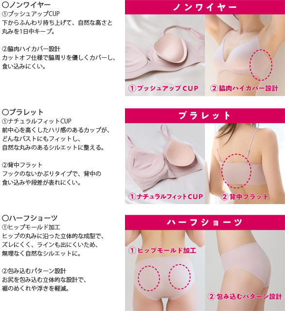 独自の「曲線立体接着」技術で縫い目をなくし、曲線をなめらかにつなぐことで、肌との摩擦を抑え、人の体に沿う繊細なつくりを実現。まるで、"肌の一部"のように馴染む着け心地で、ノンワイヤーでもバストの下の丸みにぴったり沿い、カップ上部もパカパカしにくく、1日中美しいバストシルエットをキープします。パーツ同士の段差も少なく、アウターにひびきにくい仕上がりです。