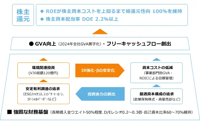 強固な財務基盤を維持しつつ、環境関連投資と資本コスト低減を両立させ、GVA向上・フリーキャッシュフロー創出する