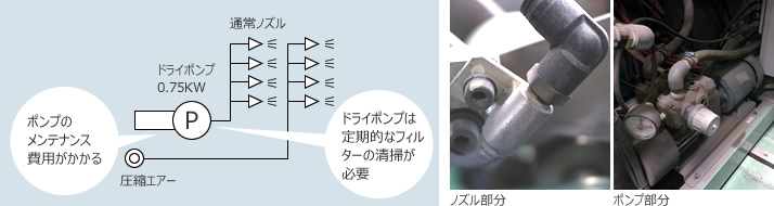 ・高効率ノズル(ジェットノズル)に取り換えてエアーの流量を増やし、ドライポンプの設置を不要にする。